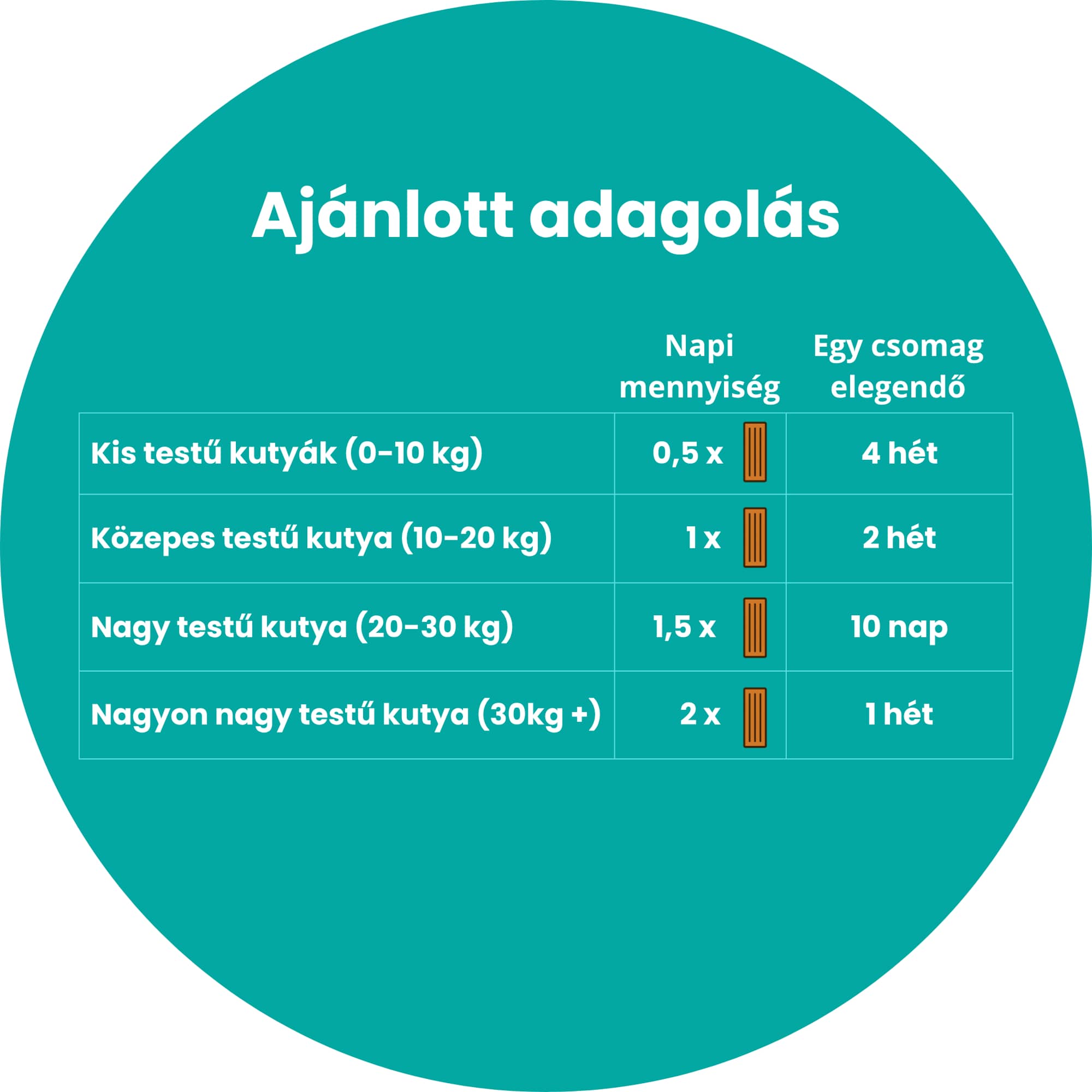 Javasoljuk a napi használatot. Állítsd be a mennyiséget a kutya súlya alapján. Kistestű kutyák esetében egy rudat darabokra törhetsz. Nagyobb kutyáknak napi egy rúdnál többre lehet szükségük.